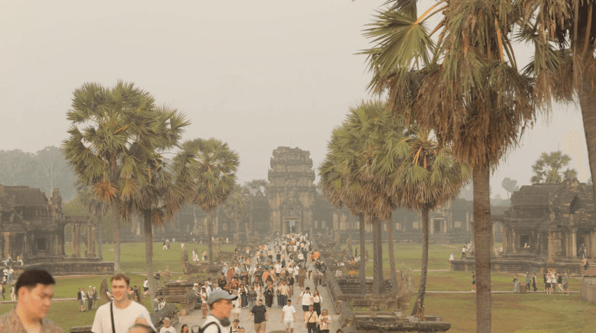 この参道はアンコールワットを象徴する景観の一つで、多くの観光客が最初に感動する場所です。
