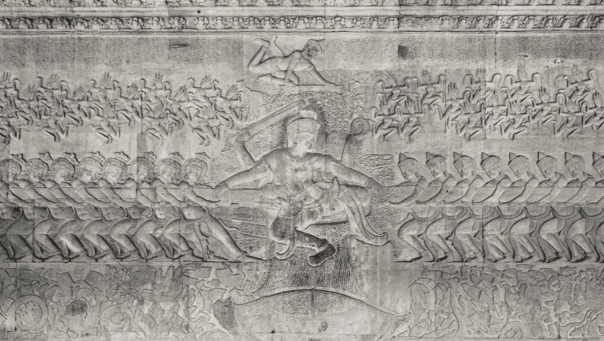 回廊の壁には、神話、戦争、王朝の歴史などが彫刻で描かれており、