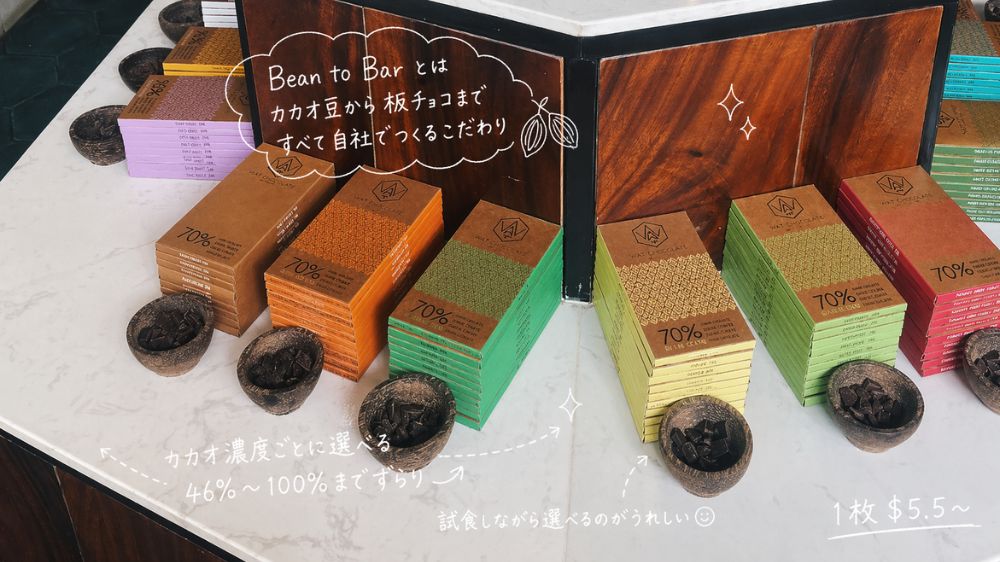 WAT Chocolateでは、板チョコやドライフルーツチョコレート、ボンボンチョコレートなどをお土産として購入できます。